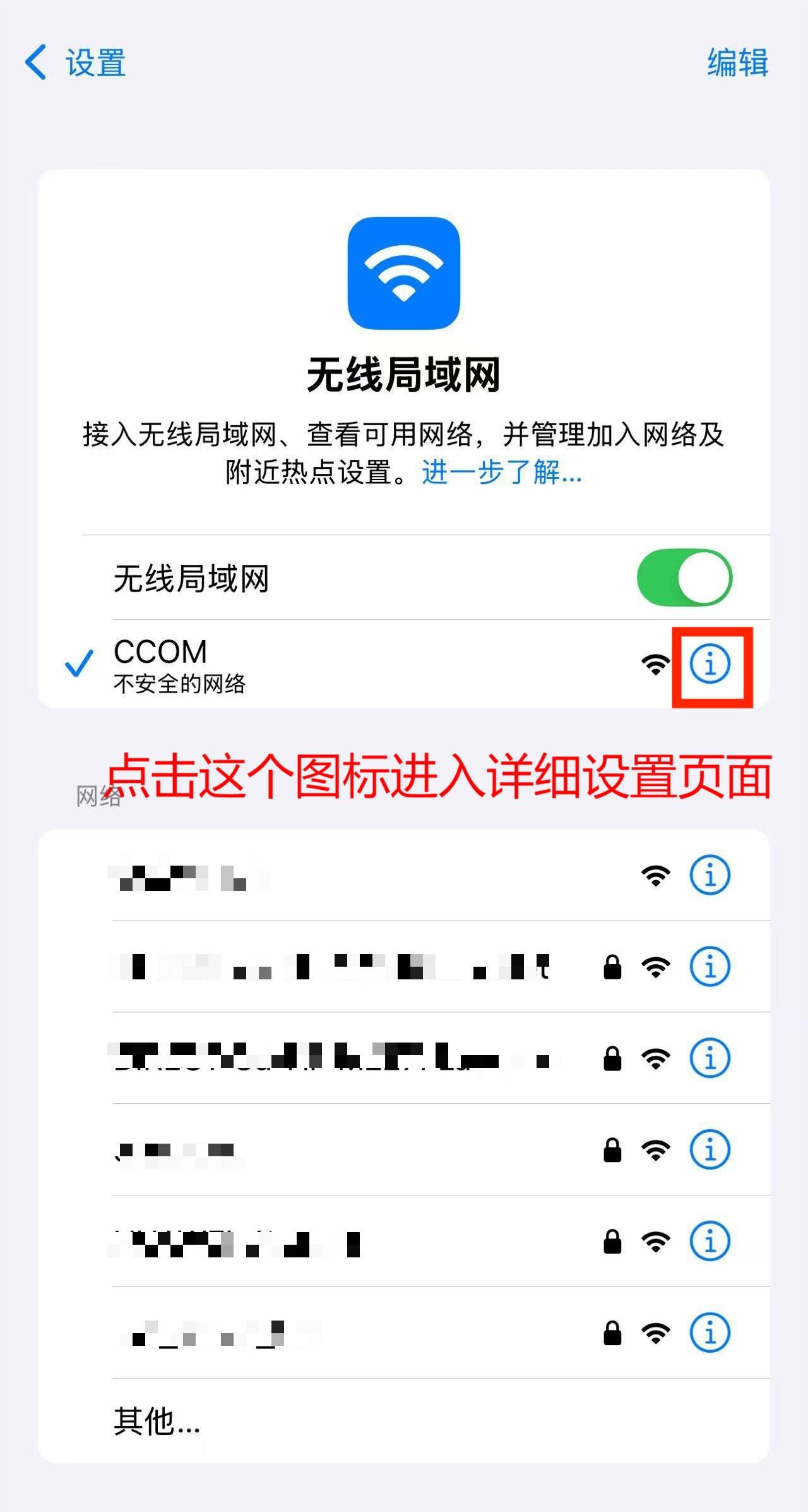 步骤一:进入手机设置页面,连接CCOM后,点击后面的图标进入详细设置页面。安卓系统类似。