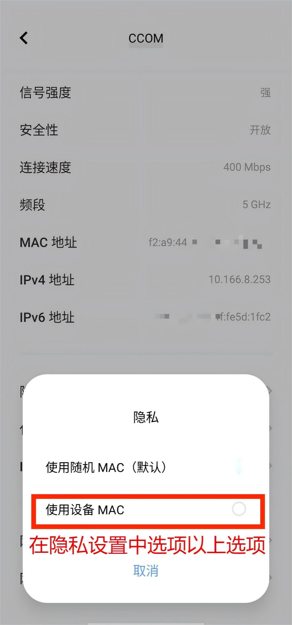 1) 苹果将“私有地址”设为固定或关闭,并重新认证。