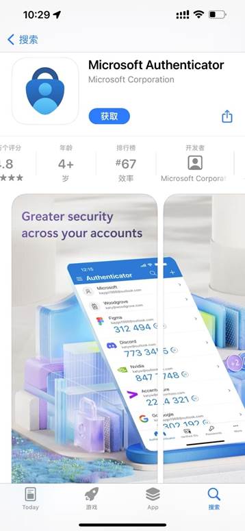 在iOS的App Store中搜索Authenticator,点击获取进行安装,如下图所示: